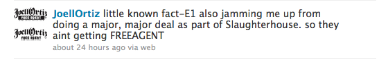 Last night, Joell Ortiz vented about his situation with E1 (Koch Records). To hear him tweet it, the label’s preventing him and his Slaughterhouse brethren from inking a deal with another entity. That’s just shady.